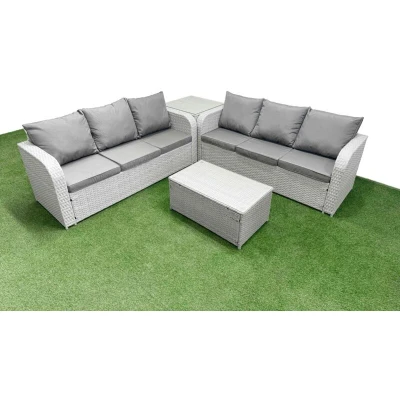 General description This 6-seater deluxe garden furniture set enhances the beauty of your courtyard, deck, backyard, porch, or swimming pool. Constructed from high-quality PE rattan and durable galvanized steel, it is designed to withstand adverse weather conditions in the UK. The set can be easily rearranged into different configurations to suit your needs. Technical specifications 2 x 3-seater Sofa Size: 177W x 67D x 79H cm 1 x Side Table: 65L x 65W x 66H cm 1 x Oblong Coffee Table: 85L x 50W x 37H cm Material: Light grey PE rattan with dark grey fabric Seat Cushion Thickness: 8 cm Glass Thickness: 5 mm tempered glass Installation Items come flat packed and are easy to assemble. Includes sturdy galvanized steel tube metal frames with powder coating to prevent rust. Usage Removable cushion covers for easy maintenance. Keep cushions indoors or use a rain cover when not in use. Use a rain cover if the furniture is not used for an extended period. Other information Factory direct sale
