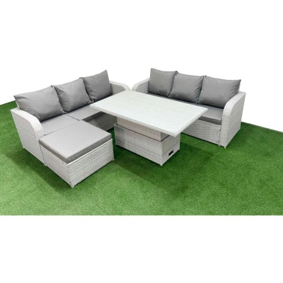 General description This 7-seater deluxe garden furniture set enhances the beauty of your courtyard, deck, backyard, porch, or swimming pool. Made from high-quality PE rattan and durable galvanized steel construction, it is designed to withstand adverse weather conditions in the UK. The set can be easily reconfigured to suit your needs at any time. Technical specifications 2 x 3-seater Sofa Size: 177W x 67D x 79H cm 1 x Big footstool: 65L x 65W x 34H cm 1 x Lifting Table Size: 140L x 80W x 68/48H cm (height adjustable: up to 68 cm, down to 48 cm) Seat Cushion Thickness: 8 cm Installation Items come flat packed and are easy to assemble. Includes sturdy galvanized steel tube metal frames with powder coating to prevent rust. Usage Keep the cushions indoors or use a rain cover when not in use. For long-term storage, cover the furniture with a rain cover. Other information Light grey PE rattan with dark grey fabric; color may vary due to lighting or monitor settings. 5mm thick transparent