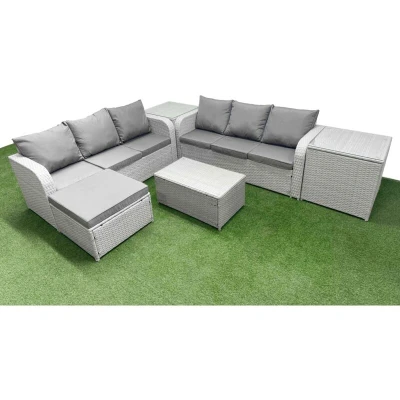 General description This 7-seater deluxe garden furniture set enhances the aesthetic of your courtyard, deck, backyard, porch, or swimming pool. Constructed from high-quality PE rattan and durable galvanized steel, it is designed to withstand adverse weather conditions and can be easily reconfigured to suit your needs. Technical specifications 2 x 3-seater Sofa Size: 177W x 67D x 79H cm 2 x Side Table: 65L x 65W x 66H cm 1 x Big Footstool: 65L x 65W x 34H cm 1 x Oblong Coffee Table: 85L x 50W x 37H cm Seat Cushion Thickness: 8 cm Material: Light grey PE rattan with dark grey fabric Glass Thickness: 5 mm tempered glass Installation Items come flat packed and are easy to assemble. The furniture features sturdy galvanized steel tube frames with powder coating to prevent rust. Usage For low maintenance, the cushion covers are removable. It is recommended to keep the cushions indoors or use a rain cover when not in use. To prolong the life of the furniture, use a rain cover if it will not