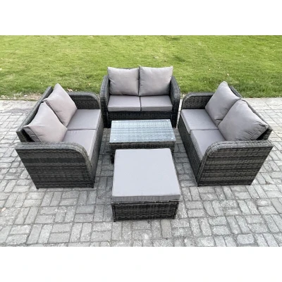 General description This outdoor rattan lounge sofa set is a great addition to your patio or garden. Made of high-quality PE rattan and durable galvanized steel construction, it offers sturdiness and longevity, making it suitable for outdoor use all year round. This set is perfect for gathering with family and friends. Technical specifications Big footstool dimensions: 65L x 65W x 34H cm Love sofa dimensions (3 pieces): 124W x 67D x 79H cm Oblong coffee table dimensions: 85L x 50W x 37H cm Seat cushion thickness: 8 cm Material: Dark grey mixed rattan with dark grey fabric 5mm thickness transparent tempered glass on the coffee table Installation Items come flat packed and are easy to assemble. Sturdy galvanized steel tube metal frames with powder coating to prevent rust. Usage Low maintenance required. Removable cushion covers for easy cleaning. Keep cushions indoors or use a rain cover when not in use. Use a rain cover if the furniture is not used for a long time. Other information