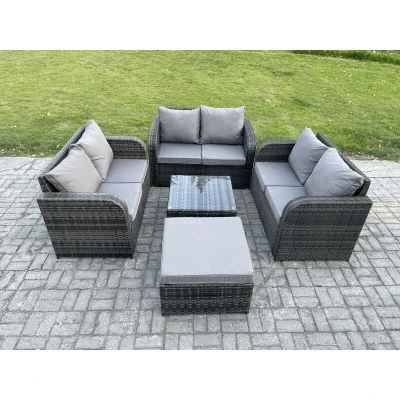 General description This modern deluxe rattan garden furniture set is perfect for various occasions, providing a stylish and comfortable seating solution for your garden, patio, or conservatory. The set includes a love seat sofa, a big footstool, and a square coffee table, all designed to enhance your outdoor experience. Technical specifications Set Dimensions: 1 x Big footstool: 65L x 65W x 34H cm 3 x Love Sofa: 124W x 67D x 79H cm 1 x Square Coffee Table: 65L x 65W x 34H cm Material: Dark grey mixed rattan with dark grey fabric Cushion Thickness: 8 cm Glass Thickness: 5 mm tempered glass Installation Items come flat packed and are easy to assemble. Sturdy galvanized steel tube metal frames with powder coating to prevent rust. Usage Keep the cushions indoors or use a rain cover when not in use. Use a rain cover to protect the furniture if not used for an extended period. Other information Removable cushion covers for easy maintenance. Factory direct sale guarantees quality and