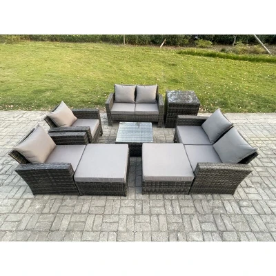 This 8 seater rattan outdoor @@@oOnWQn4jRiYAgHUtKGVI39o3Vs9qDlVn@@@ set is a great addition to patio or garden, made of high quality PE rattan and durable galvanized steel construction for sturdiness and long lasting.Durability,and this garden furniture set can be put Outdoor all year round. Set Dimensions: • 1 x Side coffee table size:65L x 65W x 66H cm • 1 x Square Coffee table size: 65L x 65W x 34H cm • 2 x Big footstool size: 65L x 65W x 34H CM • 2 x Arm chairs size: 72L x 70W x 74H CM • 2 x 2 Seater sofas size: 124L x 70W x 74H CM Dark grey mixed rattan with dark grey fabric .Color may some difference due to light or monitor .we are unable to return the item due to color problem. Items Comes Flat Packed And Easy Assemble,Sturdy Galvanized Steel Tube Metal Frames With Powder Coating To Prevent The Rust Flat PE Rattan Completely Made By Hand, 5mm Thickness transparent Tempered Glass With Sucker On Surface To Prevent Sliding Low Maintenance ,Removable Cushion Cover And Easy Move To Different Place.Pls Keep the