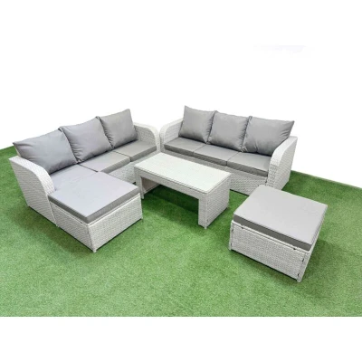 General description This 8-seater deluxe garden furniture set enhances the beauty of your courtyard, deck, backyard, porch, or swimming pool. Made from high-quality PE rattan and durable galvanized steel construction, it is designed to withstand adverse weather conditions in the UK. The set can be easily reconfigured to suit your needs at any time. Technical specifications 2 x 3-seater Sofa Size: 177W x 67D x 79H cm 2 x Big footstool: 65L x 65W x 34H cm 1 x Rectangular Coffee Table: 105L x 50W x 48H cm Material: Light grey PE rattan with dark grey fabric Thickness of tempered glass: 5mm Seat cushion thickness: 8 cm Installation Items come flat packed and are easy to assemble. Sturdy galvanized steel tube metal frames with powder coating to prevent rust. Usage Keep cushions indoors or use a rain cover when not in use. Use a rain cover to protect the furniture if not used for an extended period. Other information Removable cushion covers for easy maintenance. For any assembly issues,