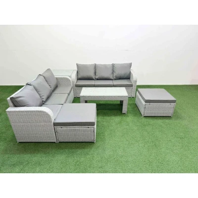 General description This 8-seater deluxe garden furniture set enhances your outdoor space, including courtyards, decks, backyards, porches, and swimming pools. Constructed from high-quality PE rattan and durable galvanized steel, it is designed to withstand adverse weather conditions in the UK. The set can be easily rearranged into various configurations to suit your needs. Technical specifications 2 x 3-seater Sofa Size: 177W x 67D x 79H cm 1 x Side Table: 65L x 65W x 66H cm 2 x Big Footstools: 65L x 65W x 34H cm 1 x Rectangular Coffee Table: 105L x 50W x 48H cm Material: Light grey PE rattan with dark grey fabric Thickness of Glass: 5mm tempered glass Seat Cushion Thickness: 8 cm Installation Items come flat packed and are easy to assemble. The furniture features sturdy galvanized steel tube frames with powder coating to prevent rust. Usage For low maintenance, the cushion covers are removable. It is recommended to keep the cushions indoors or covered with a rain cover when not in