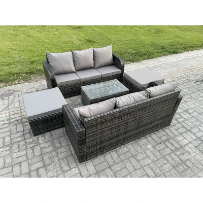 General description This 8-seater deluxe garden furniture set enhances the aesthetic of your courtyard, deck, backyard, porch, or swimming pool. Constructed with high-quality PE rattan and durable galvanized steel, it is designed to withstand adverse weather conditions in the UK. The set can be easily reconfigured to suit your needs at any time. Technical specifications 2 x Big footstool: 65L x 65W x 34H cm 2 x 3-seater Sofa: 177W x 67D x 79H cm 1 x Oblong Coffee Table: 85L x 50W x 37H cm Material: Dark grey mixed rattan with dark grey fabric Seat cushion thickness: 8 cm Glass thickness: 5 mm tempered glass Installation Items come flat packed and are easy to assemble. Includes sturdy galvanized steel tube metal frames with powder coating to prevent rust. Usage Keep the cushions indoors or use a rain cover when not in use. For long-term storage, cover the furniture with a rain cover. Other information Removable cushion covers for easy maintenance. Factory direct sale guarantees quality