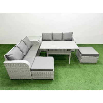 General description This 8-seater deluxe garden furniture set enhances the aesthetic of your courtyard, deck, backyard, porch, or swimming pool. Constructed from high-quality PE rattan and durable galvanized steel, it is designed to withstand adverse weather conditions and can be easily reconfigured to suit your needs. Technical specifications 2 x 3-seater Sofa Size: 177W x 67D x 79H cm 1 x Side Table Size: 65L x 65W x 66H cm 2 x Big Footstool Size: 65L x 65W x 34H cm 1 x Dining Table Size: 140L x 80W x 68H cm Material: Light grey PE rattan with dark grey fabric Seat Cushion Thickness: 8 cm Glass Thickness: 5 mm tempered glass Installation Items come flat packed and are easy to assemble. The furniture features sturdy galvanized steel tube frames with powder coating to prevent rust. Usage For low maintenance, the cushion covers are removable. It is recommended to keep the cushions indoors or covered with a rain cover when not in use. To prolong the life of the furniture, use a rain