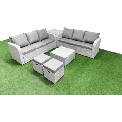 General description This 8-seater deluxe garden furniture set enhances the aesthetic of your courtyard, deck, backyard, porch, or swimming pool. Constructed from high-quality PE rattan and durable galvanized steel, it is designed to withstand adverse weather conditions and can be easily reconfigured to suit your needs. Technical specifications 2 x 3-seater Sofa Size: 177W x 67D x 79H cm 1 x Side Table: 65L x 65W x 66H cm 2 x Fully Assembled Stools: 40W x 40D x 34H cm 1 x Square Coffee Table: 65L x 65W x 34H cm Seat Cushion Thickness: 8 cm Material: Light grey PE rattan with dark grey fabric Glass Thickness: 5 mm tempered glass Installation Items come flat packed and are easy to assemble. The furniture features sturdy galvanized steel tube frames with powder coating to prevent rust. Usage For low maintenance, the cushion covers are removable. It is recommended to keep the cushions indoors or use a rain cover when not in use. To prolong the life of the furniture, use a rain cover if it