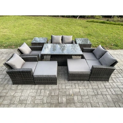 Outdoor Garden Furniture Sets 9 Pieces Wicker Rattan Sofa Dining Table Set with 2 Big Footstool Side Tables Dark Grey Mixed Fimous