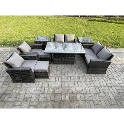 Outdoor Garden Furniture Sets 9 Pieces Wicker Rattan Sofa Dining Table Set with 2 Small Footstools Side Tables Dark Grey Mixed Fimous