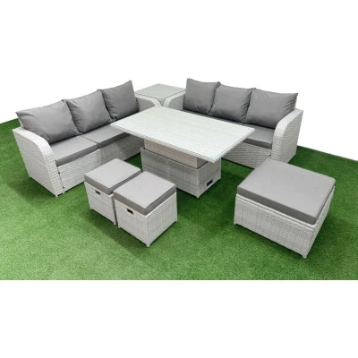 General description This 9-seater deluxe garden furniture set enhances the aesthetic of your courtyard, deck, backyard, porch, or swimming pool. Constructed with high-quality PE rattan and durable galvanized steel, it is designed to withstand adverse weather conditions in the UK. The set can be easily reconfigured to suit your needs at any time. Technical specifications 2 x 3-seater Sofa Size: 177W x 67D x 79H cm 1 x Side Table Size: 65L x 65W x 66H cm 1 x Big Footstool Size: 65L x 65W x 34H cm 2 x Fully Assembled Stools Size: 40W x 40D x 34H cm 1 x Lifting Table Size: 140L x 80W x 68/48H cm (height adjustable: up 68 cm, down 48 cm) Color: Light grey PE rattan with dark grey fabric Installation Items come flat packed and are easy to assemble. Includes sturdy galvanized steel tube metal frames with powder coating to prevent rust. Usage Low maintenance with removable cushion covers. Keep cushions indoors or use a rain cover when not in use. Use a rain cover if the furniture is not used