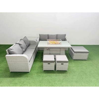 General description This Fimous Outdoor Garden Furniture Set is designed for comfort and style, accommodating up to 9 people. It features a light grey PE rattan finish complemented by dark grey fabric cushions, creating an elegant outdoor seating area. The set includes a firepit dining table, high back lounge sofas, and stools, making it perfect for gatherings and relaxation. Technical specifications 2 x 3-seater Sofa Size: 177W x 67D x 79H cm 1 x Side Table Size: 65L x 65W x 66H cm 1 x Big Footstool Size: 65L x 65W x 34H cm 2 x Fully Assembled Stools Size: 40W x 40D x 34H cm 1 x Firepit Dining Table Size: 140L x 80W x 69H cm 8 cm Thick Seat Cushion with Soft Pillow Back Cushion Material: Handcrafted PE Rattan with Powder Coated Galvanized Steel Frame 5mm Thickness Transparent Tempered Glass Installation Items come flat packed and are easy to assemble. Ensure to check the product carefully before signing for delivery. Usage Place the gas fire pit on the glass top, not under it, and