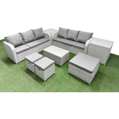 General description This 9-seater deluxe garden furniture set enhances the aesthetic of your courtyard, deck, backyard, porch, or swimming pool. Constructed with high-quality PE rattan and durable galvanized steel, it is designed to withstand adverse weather conditions in the UK. The set can be easily rearranged into various configurations to suit your needs. Technical specifications 2 x 3-seater Sofa Size: 177W x 67D x 79H cm 2 x Side Table: 65L x 65W x 66H cm 1 x Big Footstool: 65L x 65W x 34H cm 2 x Fully Assembled Stools: 40W x 40D x 34H cm 1 x Oblong Coffee Table: 85L x 50W x 37H cm Color: Light grey PE rattan with dark grey fabric Seat Cushion Thickness: 8 cm Installation Items come flat packed and are easy to assemble. Sturdy galvanized steel tube metal frames with powder coating to prevent rust. Usage Low maintenance with removable cushion covers. Keep cushions indoors or use a rain cover when not in use. Use a rain cover if the furniture is not used for an extended period.