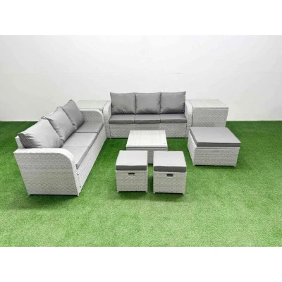 General description This 9-seater deluxe garden furniture set enhances the beauty of your courtyard, deck, backyard, porch, or swimming pool. Constructed with high-quality PE rattan and durable galvanized steel, it is designed to withstand adverse weather conditions. The set can be easily rearranged into various configurations to suit your needs. Technical specifications 2 x 3-seater Sofa Size: 177W x 67D x 79H cm 2 x Side Table: 65L x 65W x 66H cm 1 x Big Footstool: 65L x 65W x 34H cm 2 x Fully Assembled Stools: 40W x 40D x 34H cm 1 x Square Coffee Table: 65L x 65W x 34H cm Seat Cushion Thickness: 8 cm Material: Light grey PE rattan with dark grey fabric Glass Thickness: 5 mm tempered glass Installation Items come flat packed and are easy to assemble. Sturdy galvanized steel tube metal frames with powder coating to prevent rust. Usage Low maintenance required. Removable cushion covers for easy cleaning. Recommended to keep cushions indoors or use a rain cover when not in use. Use a