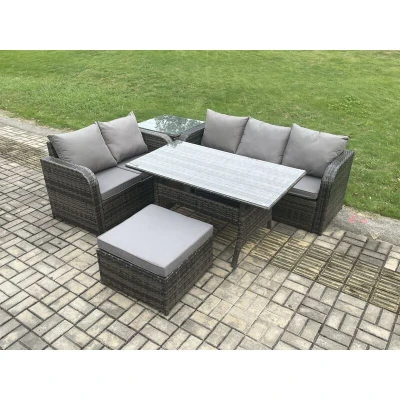 Outdoor Garden Patio Furniture Wicker Rattan Oblong Rectangular Dining Table and Lounge Sofa set with Side Big Footstool Dark Grey Mixed