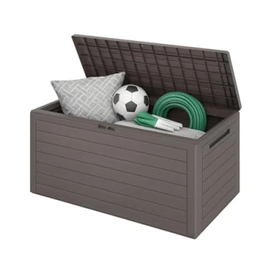 ManoManoGeneral description This stylish and spacious 280L plastic cushion box is a contemporary garden storage solution that combines functionality with modern design. It offers ample space for seat pads, cushions, and various garden accessories, ensuring your outdoor essentials are neatly organized and easily accessible. The wood-look design allows it to blend seamlessly with your existing outdoor furniture, adding a decorative touch to your space. Technical specifications Dimensions (LxWxH): 120 x 46 x 57 cm (47.24 x 18.11 x 22.44 in) Interior dimensions: 116 x 43 x 54 cm (45.66 x 16.92 x 21.25 in) Material: Weatherproof and UV-resistant plastic (polypropylene) Capacity: 280L Colour: Grey Compatibility and accessories Locking device for padlock (padlock not included) Installation Easy assembly with a simple click system, requiring no tools for setup Usage Ideal for storing pillows, cushions, and other garden accessories Suitable for terrace, balcony, and garden Not suitable for sitting or