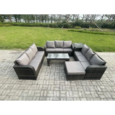 General description This 10-seater outdoor rattan lounge sofa set is an excellent addition to your patio or garden. It is crafted from high-quality PE rattan and features a durable galvanized steel construction, ensuring sturdiness and longevity. This set is designed for outdoor use all year round, making it perfect for gatherings with family and friends. Technical specifications 1 x Side coffee table: 65L x 65W x 66H cm 1 x Big footstool: 65L x 65W x 34H cm 3 x 3-seater Sofa Size: 177W x 67D x 79H cm 1 x Oblong Coffee table: 105L x 50W x 48H cm Color: Dark grey mixed rattan with dark grey fabric Seat cushion thickness: 8 cm Installation The items come flat packed and are easy to assemble. The set features sturdy galvanized steel tube metal frames with powder coating to prevent rust. The PE rattan is completely handmade, and the set includes 5mm thick transparent tempered glass with suckers on the surface to prevent sliding. Usage This outdoor lounge sofa set is low maintenance, with