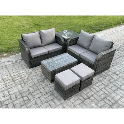 General description This 6-seater deluxe garden furniture set enhances the aesthetic of your courtyard, deck, backyard, porch, or swimming pool. Constructed from high-quality PE rattan and durable galvanized steel, it is designed to withstand adverse weather conditions and can be easily reconfigured to suit your needs. Technical specifications Side coffee table dimensions: 65L x 65W x 66H cm Small footstool dimensions (2 units): 40L x 40W x 34H cm Love sofa dimensions (2 units): 124W x 67D x 79H cm Oblong coffee table dimensions: 85L x 50W x 37H cm Seat cushion thickness: 8 cm Material: Dark grey mixed rattan with dark grey fabric 5mm thickness transparent tempered glass with sucker on surface Installation Items come flat packed and are easy to assemble. Sturdy galvanized steel tube metal frames with powder coating to prevent rust. Usage Low maintenance; removable cushion covers for easy cleaning. Keep cushions indoors or use a rain cover when not in use. Use a rain cover if the