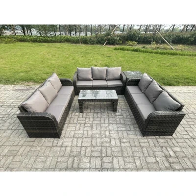 General description This 9-seater outdoor rattan lounge sofa set is an excellent addition to your patio or garden. It is made of high-quality PE rattan and features a durable galvanized steel construction, ensuring sturdiness and longevity. This set is designed for outdoor use all year round, making it perfect for gatherings with family and friends. Technical specifications 1 x Side coffee table: 65L x 65W x 66H cm 3 x 3-seater Sofa Size: 177W x 67D x 79H cm 1 x Oblong Coffee table: 105L x 50W x 48H cm Color: Dark grey mixed rattan with dark grey fabric Seat cushion thickness: 8 cm Installation Items come flat packed and are easy to assemble. Usage Keep the cushions indoors or use a rain cover when not in use. For long-term storage, cover the furniture with a rain cover. Other information 5mm thickness transparent tempered glass with suckers on the surface to prevent sliding. Sturdy galvanized steel tube metal frames with powder coating to prevent rust. If you encounter any issues