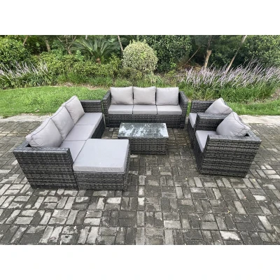 General description This PE rattan outdoor furniture set is an excellent addition to your patio or garden. It is crafted from high-quality PE rattan and features a durable galvanized steel construction, ensuring sturdiness and longevity. This garden furniture set is designed for outdoor use all year round. Technical specifications Set Dimensions: 2 x Three Seater Sofa: 177W x 65D x 66H cm 2 x Chair: 74W x 65D x 66H cm 1 x Oblong Table: 85L x 50W x 37H cm 1 x Big Footstool: 65L x 65W x 35H cm Sofa Weight Capacity: 250 kg Table Weight Capacity: 80 kg Color: Dark grey mixed rattan with dark grey fabric Installation Items come flat packed and are easy to assemble. Includes sturdy galvanized steel tube metal frames with powder coating to prevent rust. Usage Keep the cushions indoors or use a rain cover when not in use. Use a rain cover to protect the furniture if not used for an extended period. 8 cm thick seat cushions with soft pillow back cushions provide added comfort. Other