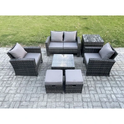This wicker rattan lounge sofa Set can be used both indoors and Outdoor,with high quality PE rattan and durable galvanized steel construction for sturdiness and long lasting. Outdoor garden furniture can also be placed on the patio or balcony,The design of this rattan furniture is a perfect blend of country chic and modern minimalism, adding an elegant touch to your house. Set Dimensions: • 1 x Side coffee table size:65L x 65W x 66H cm • 1 x Square Coffee table size: 65L x 65W x 34H cm • 2 x Small Fully assembled footstool size: 40L x 40W x 37H CM • 2 x Arm chairs size: 72L x 70W x 74H CM • 1 x 2 Seater sofas size: 124L x 70W x 74H CM Dark grey mixed rattan with dark grey fabric .Color may some difference due to light or monitor .we are unable to return the item due to color problem. Items Comes Flat Packed And Easy Assemble,Sturdy Galvanized Steel Tube Metal Frames With Powder Coating To Prevent The Rust Flat PE Rattan Completely Made By Hand, 5mm Thickness transparent Tempered Glass