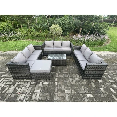 General description This outdoor garden furniture sofa set provides ample seating for up to 10 people, featuring a tempered glass coffee table ideal for holding food, drinks, and more. It is a perfect addition to your patio, garden, backyard, pool, and other indoor and outdoor spaces. Technical specifications 3 x Three Seater Sofa: 177W x 65D x 66H cm 1 x Oblong Table: 85L x 50W x 37H cm 1 x Big Footstool: 65L x 65W x 35H cm Sofa Weight Capacity: 250 kg Table Weight Capacity: 80 kg Material: Dark grey mixed rattan with dark grey fabric Cushion Thickness: 8 cm Installation Items come flat packed and are easy to assemble. The set features sturdy galvanized steel tube metal frames with powder coating to prevent rust. Usage This furniture set is designed for low maintenance. The cushion covers are removable, and it is recommended to keep the cushions indoors or covered with a rain cover when not in use. To maintain the furniture, use a rain cover if it will not be used for an extended