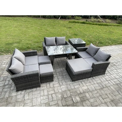 Outdoor Lounge Sofa Set Wicker pe Rattan Garden Furniture with Rectangular Dining Table 2 Seat 3 Footstools Side Dark Grey Mixed