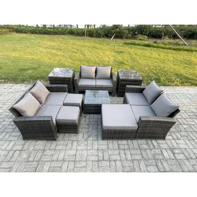 General description This outdoor garden furniture sofa set provides ample seating for up to 9 people, making it an ideal addition to your patio, garden, backyard, or pool area. It includes a tempered glass coffee table, perfect for holding food and drinks, along with comfortable seating options. Technical specifications 2 x Side coffee table size: 65L x 65W x 66H cm 1 x Square coffee table size: 65L x 65W x 34H cm 1 x Big footstool size: 65L x 65W x 34H cm 2 x Small footstools size: 40L x 40W x 37H cm 3 x 2 Seater sofas size: 124L x 70W x 74H cm Material: Dark grey mixed rattan with dark grey fabric 8 cm thick seat cushion with soft pillow back cushion Installation Items come flat packed and are easy to assemble. The furniture features sturdy galvanized steel tube metal frames with powder coating to prevent rust. Usage For maintenance, keep the cushions indoors or use a rain cover when not in use. It is recommended to cover the furniture with a rain cover if not used for an extended