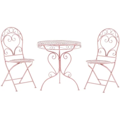 General description This beautiful 3-piece bistro set, designed with a vintage touch, is an eye-catching addition to any garden or balcony. Its pink, powder-coated frame features gorgeous open scrollwork, creating a romantic vibe. Made from iron, this outdoor set is easy to clean and, with proper maintenance, will last for many years. Technical specifications Product Type: Bistro Set Style: Retro General Color: Pink Material Type: Metal Main Material: Iron Top Material: Metal Finish: Powder Coated Seats Up To: 2 People Chair Dimensions: 42x55x94 cm Coffee Table Dimensions: 70x70x74 cm Seat Height: 45 cm Overall Dimensions: 70x70x74 cm Weight: 17 kg Chair Weight Capacity: 110 kg Table Weight Capacity: 5 kg Installation Partial Assembly Required Estimated Assembly Time: 15 minutes Usage To increase durability, keep the furniture dry and clean regularly with mild cleaners. Avoid alkaline or acid-based cleaners to ensure corrosion protection. When not in use, store the furniture indoors