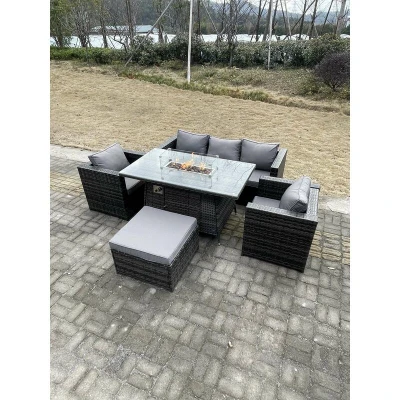 Outdoor pe Rattan Garden Furniture Gas Fire Pit Dining Table Armchairs With Big Footstool Dark Grey Mixed Fimous