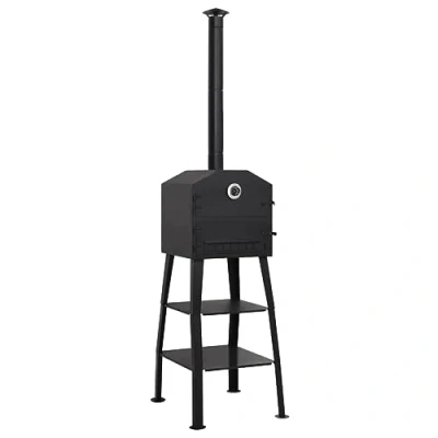 General description Whether for pizzas, bread, cakes, or pies, nothing can match the inimitable smoky taste of traditional charcoal-fired ovens! In the comfort of your own garden, you will be able to bake authentic-tasting pizzas and don't be surprised if the scent brings you envious glances from your neighbours. This standalone oven is suitable for all types of charcoal. Technical specifications Colour: Black Material: Steel Oven dimensions: 54 x 59 x 203 cm (W x D x H) Baking compartment dimensions: 39.5 x 42.5 x 22 cm (W x D x H) Built-in thermometer: Included Baking base: 2 x Fireclay brick Fire/ash tray: Removable Removable fire tray: Yes Usage The top compartment is used for baking and its base is made of two refractory ('fireclay') bricks, which distribute the heat evenly within the oven and can withstand temperatures of up to 1300℃. The bricks also ensure that your food will not be soiled by flying ash or dust from the fire. The two shelves provided underneath the oven are