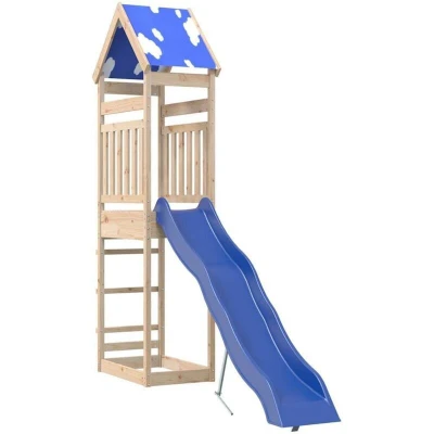 ManoManoGeneral description Do you want to give your children the freedom to play at home? This wooden outdoor playset transforms your backyard into a playground for imaginative adventures! The climbing frame is made of solid pine wood, known for its strength and durability, with straight grains and distinctive knots that contribute to its rustic charm. The wooden frame ensures sturdiness and stability, while the thoughtful design includes surrounding wooden railings for safety and a cloud roof for shade on hot summer days. Technical specifications Overall dimensions: 52.5 x 292 x 265 cm (L x W x H) Play tower material: Solid pinewood (untreated) Roof material: Polyester Play tower dimensions: 85 x 52.5 x 265 cm (L x W x H) Platform height: 118 cm Wave slide color: Blue Wave slide material: PP (Polypropylene) Wave slide size: 210 x 40 cm (L x W) Applicable installation height for slide: 118 cm Total width of the slide: 40 cm Sliding part width: 32 cm Maximum user weight: 45 kg Assembly