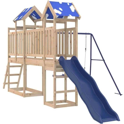 Do you want to give your children the freedom to play at home? This wooden outdoor playset transforms your backyard into a playground for imaginative adventures! Durable material: This garden playset frame is made of solid pine wood. Solid pinewood is known for its strength and durability. Its straight grains and distinctive knots contribute to its rustic charm.Stable wooden frame: The wooden frame of the garden playhouse ensures sturdiness and stability. In addition, the "A" shaped legs of the children's swing allow for balance.Multi-activity centres: The climbing frame features a 90 cm height platform and stands out with its wave slide, a double swing set, a ladder as well as sandpits. Your little ones can also invite their friends to join the fun.Thoughtful design: The surrounding wooden railings are designed to ensure the safety of children during their happy play. Also, the cloud roof provides shade for your children on hot summer days.Endless fun: This fun-filled wooden outdoor playset is the perfect way for your children and their friends to enjoy entertainment, have more interactive time and make memories for you and your children! Warning:Only for domestic useOutdoor useNot suitable for children under 3 yearsRecommend user age: 3-8 years old