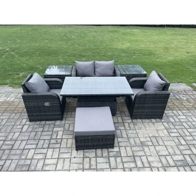 General description This deluxe rattan sofa rising dining table set is a great addition to your patio or garden. Made of high-quality PE rattan and durable galvanized steel construction, it offers sturdiness and long-lasting durability, making it suitable for outdoor use all year round. The table can be used as both a coffee and dining table, providing versatility at a competitive price compared to other stores. Technical specifications Big Footstool: 65L x 65W x 34H cm Side coffee tables (2): 65L x 65W x 66H cm Reclining chairs (2): 74W x 69D x 79H cm Love sofa: 124W x 69D x 79H cm Rising dining table: 140L x 80W x 68/48H cm (height adjustable from 68 cm to 48 cm) Material: Dark grey mixed rattan with dark grey fabric Seat cushion thickness: 8 cm Glass tabletop: 5 mm thickness clear tempered glass with suckers to prevent sliding Installation Items come flat-packed and require self-assembly. The set features sturdy galvanized steel tube metal frames with powder coating to prevent