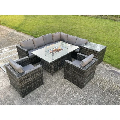 Outdoor Rattan Garden Corner Furniture Gas Fire Pit Dining Table Heater Sets Lounge Chairs Side Dark Grey 8 Seater Fimous