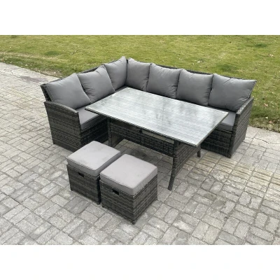 Outdoor Rattan Garden Furniture Corner Sofa Set with Rectangular Dining Table 2 Small Footstools Patio Wicker Dark Grey Mixed Fimous
