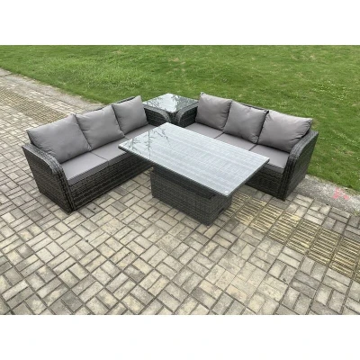 Outdoor Rattan Garden Furniture Lounge Sofa Set with Height Adjustable Rising lifting Dining Table Dark Grey Mixed Fimous