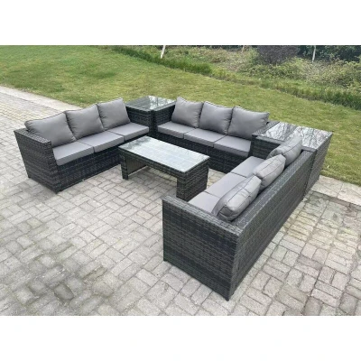 General description This classic outdoor rattan garden furniture lounge sofa set is designed to accommodate up to 9 people. It features a comfortable and soft cushion back, crafted from premium dark grey rattan that is durable enough to withstand British weather conditions. Technical specifications 3 x Double armrest Sofa Size: 176W x 65D x 66H cm 1 x Coffee Table Size: 105L x 50W x 48H cm 2 x Side Table Size: 65W x 65D x 66H cm Sofa Weight Capacity: 250 kg Material: Dark grey mixed PE Rattan Glass Thickness: 5 mm Tempered Glass Cushion Thickness: 8 cm Installation The items come flat packed and are easy to assemble. The set features sturdy galvanized steel tube metal frames with powder coating to prevent rust. Usage For optimal maintenance, keep the cushions indoors or use a rain cover when not in use. It is recommended to cover the furniture with a rain cover if it will not be used for an extended period. Other information Factory direct sale guarantees quality and after-sale