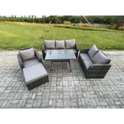 General description This 5-piece deluxe Garden furniture set enhances your outdoor space, including courtyards, decks, backyards, porches, and swimming pools. Made from high-quality PE rattan and durable galvanized steel, it is designed to withstand adverse weather conditions in the UK. The set can be easily reconfigured to suit your needs. Technical specifications Big footstool: 65L x 65W x 34H cm Reclining Chair: 74W x 67D x 79H cm Love Sofa: 124W x 67D x 79H cm 3 Seater Sofa: 177W x 67D x 79H cm Rectangular Dining Table: 110L x 70W x 70H cm Seat Cushion Thickness: 8 cm Material: Dark grey mixed rattan with dark grey fabric Installation Items come flat packed and are easy to assemble. Includes sturdy galvanized steel tube metal frames with powder coating to prevent rust. Usage The reclining chairs can be adjusted from 90° to 130° using a button. For maintenance, keep the cushions indoors or use a rain cover when not in use. It is recommended to cover the furniture with a rain cover