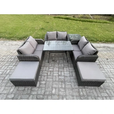Outdoor Rattan Garden Furniture Set 8 Seater Patio Love Sofa with Rectangular Dining Table 2 Big Footstool Side Dark Grey Mixed Fimous
