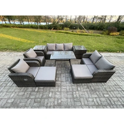 Outdoor Rattan Garden Furniture Set 9 Seater Patio Lounge Sofa with Dining Table 2 Big Footstool Side Tables Dark Grey Mixed Fimous