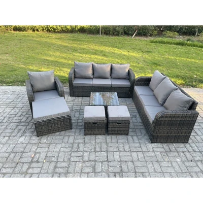 General description This 10-seater modern deluxe garden furniture set is perfect for various occasions. The rattan set boasts strong durability, ensuring it lasts for a long time, and features a sturdy tempered glass tabletop. Cushions are included and designed to fit the shape of the sofa for added comfort. This stylish furniture will enhance any garden, patio, or conservatory. Technical specifications Big footstool dimensions: 65L x 65W x 34H cm Small footstool dimensions: 40L x 40W x 34H cm (2 pieces) Reclining chair dimensions: 74L x 67W x 79H cm 3-seater sofa dimensions: 177W x 67D x 79H cm (2 pieces) Square coffee table dimensions: 65L x 65W x 34H cm Seat cushion thickness: 8 cm Material: Dark grey mixed rattan with dark grey fabric Frame: Sturdy galvanized steel tube with powder coating to prevent rust Glass: 5mm thick transparent tempered glass with suckers to prevent sliding Installation Items come flat packed and are easy to assemble. Usage Keep cushions indoors or use a
