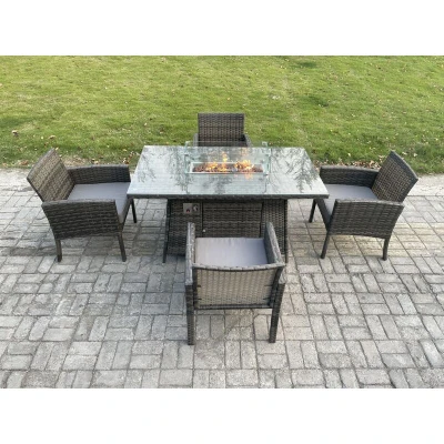 Outdoor Rattan Garden Furniture Set Gas Fire Pit Rectangular Table Sets Heater with 4 Seater Dining Cahirs Dark Grey Mixed Fimous