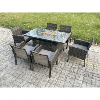 Outdoor Rattan Garden Furniture Set Gas Fire Pit Rectangular Table Sets Heater with 6 Seater Dining Cahirs Dark Grey Mixed Fimous