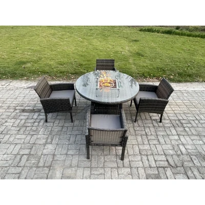 Outdoor Rattan Garden Furniture Set Gas Fire Pit Round Table Sets Heater with 4 Seater Dining Cahirs Dark Grey Mixed Fimous
