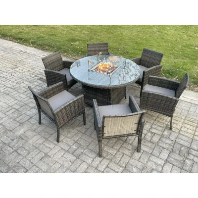 Outdoor Rattan Garden Furniture Set Gas Fire Pit Round Table Sets Heater with 6 Seater Dining Cahirs Dark Grey Mixed Fimous