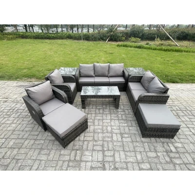 Outdoor Rattan Garden Furniture Set Lounge Sofa with Rectangular Coffee Table 2 Side Tables Big Footstool Dark Grey Mixed Fimous