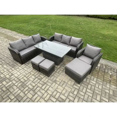 Outdoor Rattan Garden Furniture Sets Height Adjustable Rising lifting Dining Table Sofa Set with Reclining Chair 3 Footstools Dark Grey Mixed Fimous