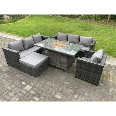 Outdoor Rattan Garden Furniture Sofa Set Gas Fire Pit Dining Table Heater Burner With Armchair Big Footstool 8 Seater Dark Grey Mixed Fimous