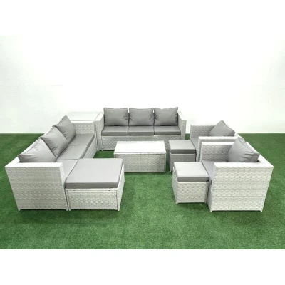 Outdoor Rattan Sofa Garden Furniture Set with 2 Armchairs Oblong Coffee Table 3 Footstools Side Light Grey Mixed Fimous