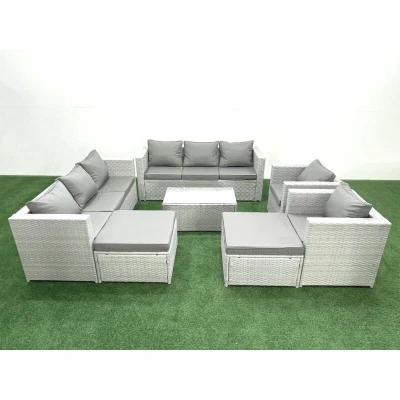 Outdoor Rattan Sofa Garden Furniture Set with 2 Armchairs Oblong Coffee Table Big Footstools Light Grey Mixed Fimous
